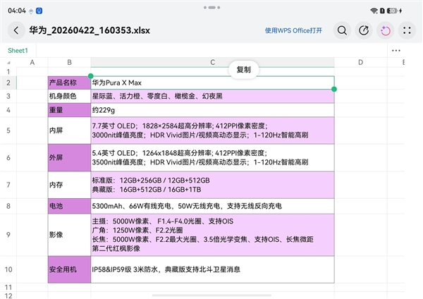 面向专业设想、新运营等进阶需求,华为Pura X Max的视野也要比曲板机更宽广,2584×1828像素的比例接近小平板。